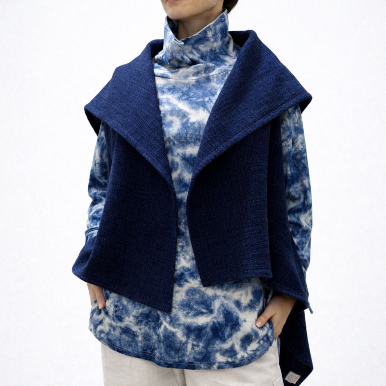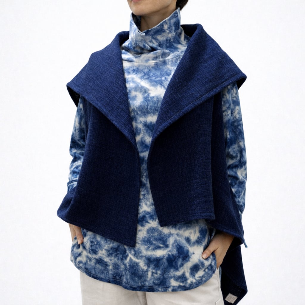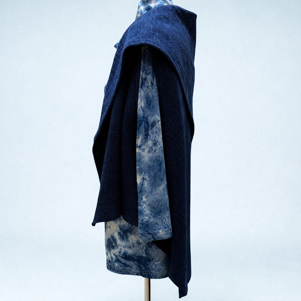 手紡ぎ・手織りのカディ生地を、深みのある藍で丁寧に染め上げた変形ベスト。