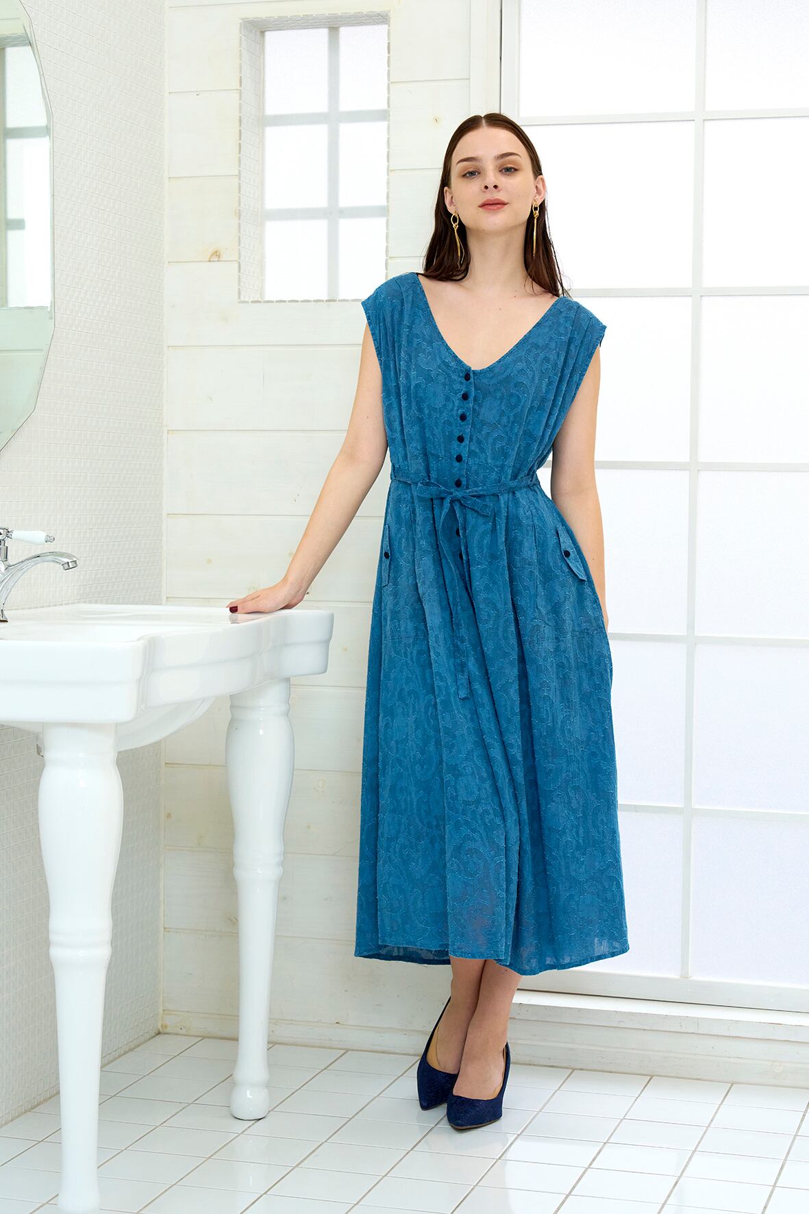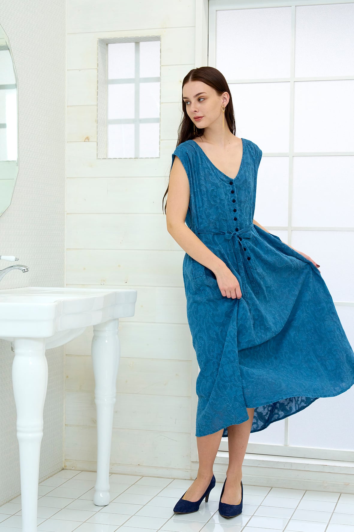 このワンピースを身に着けていると、どこか懐かしい日本の風景が浮かんでくるような気がします。自然派のデザインが持つ魅力と、藍染の深い青が奏でる安らぎを、ぜひあなたも体感してください。