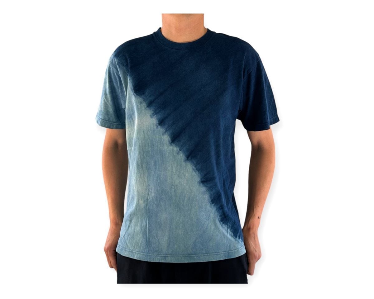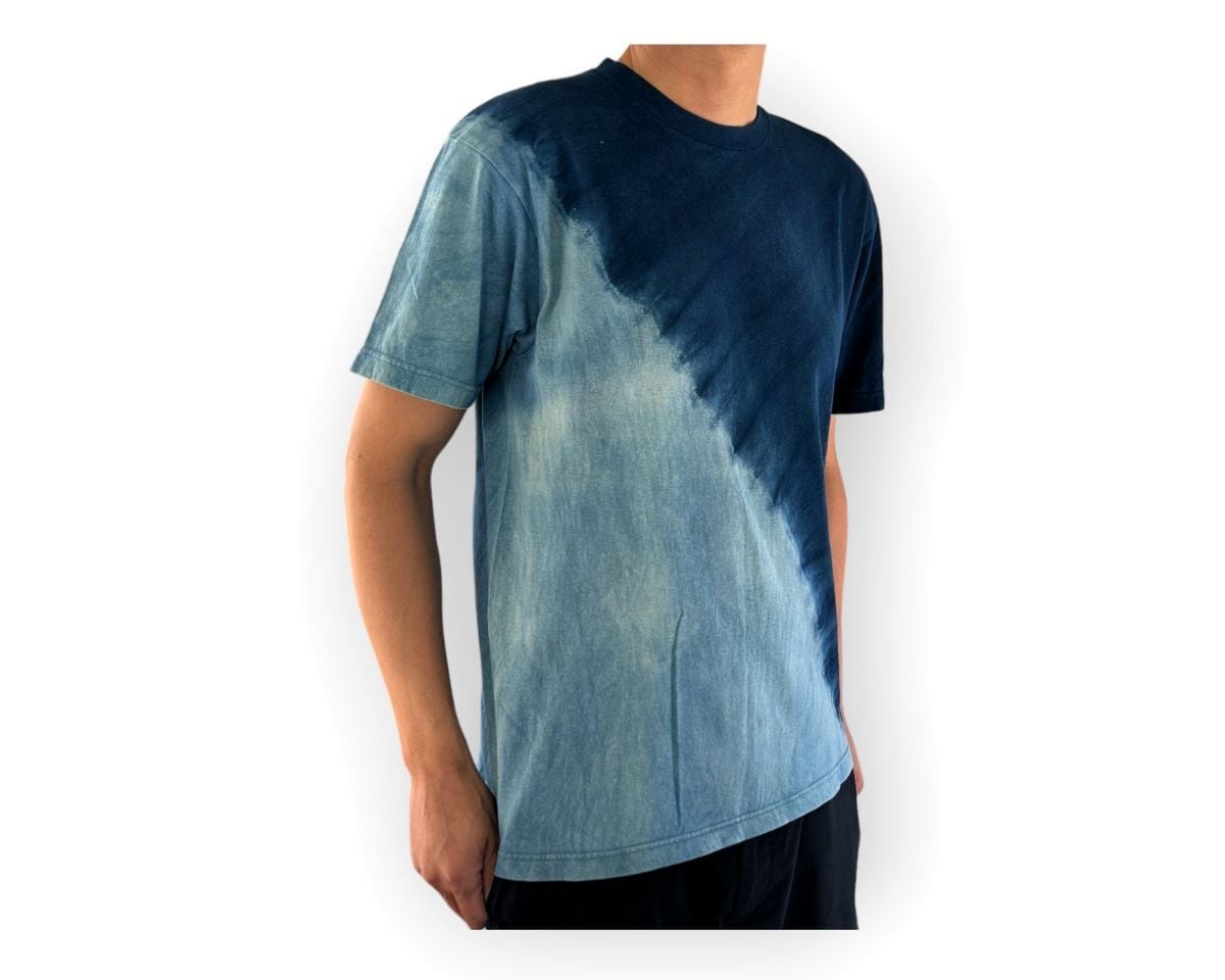 藍染の濃淡ぼかしTシャツは、伝統的な技法と現代のデザインが見事に融合したアイテムです。藍染めの独特な技術によって、柔らかなグラデーションが生み出され、深い青から淡い色合いまで織りなす美しい模様が特徴です。その繊細なぼかし効果は、Tシャツに独自の魅力と個性を与え、着る人のスタイルを際立たせます。